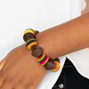 Purple wooden discs and chunky brown wooden beads are threaded along a stretchy band around the wrist, creating a summery look. Also available in Multi