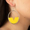 Featuring a triangular cut, a crescent shaped brown wooden frame is fitted in place along the bottom of a shiny silver hoop, creating a retro lure. Earring attaches to a standard fishhook fitting.