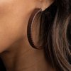 A black leather lace wraps around a thick silver hoop, creating an edgy display. Earring attaches to a standard post fitting. Hoop measures approximately 2 1/2" in diameter. Also available in Brown