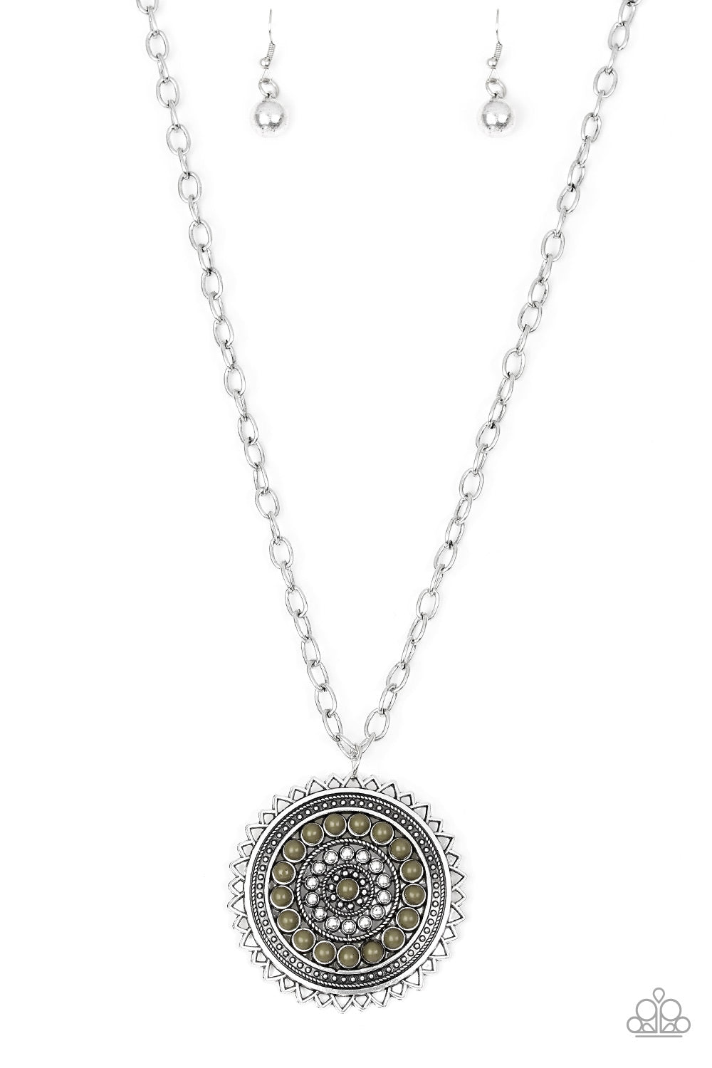 Radiating with shimmery sunburst details, a Martini Olive beaded silver pendant swings from the bottom of a lengthened silver chain for a tribal inspired look. Features an adjustable clasp closure. Also available in Black, Blue, and Yellow