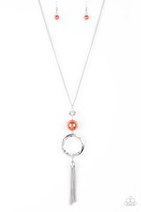 Infused with a lengthened silver chain, a faceted crystal-like bead, an oversized pearly brown bead, and a hammered silver hoop give way to a shimmery silver tassel for a refined look. Features an adjustable clasp closure. Also available in Orange and White