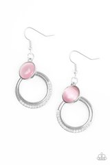 Glistening silver hoops swing from the bottom of a glowing blue moonstone fitting. The bottom of the lowermost hoop is encrusted in glassy white rhinestones for a whimsical finish. Earring attaches to a standard fishhook fitting. Also available in Pink and Blue