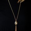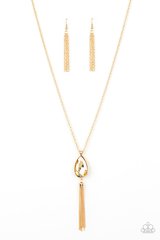 A green teardrop gem swings from the bottom of a lengthened silver chain for a dramatic look. A shimmery silver chain tassel swings from the bottom of the pendant for a glamorous finish. Features an adjustable clasp closure. Also available in Gold
