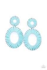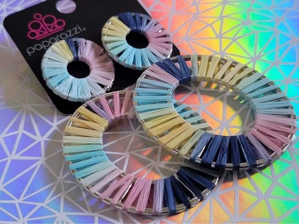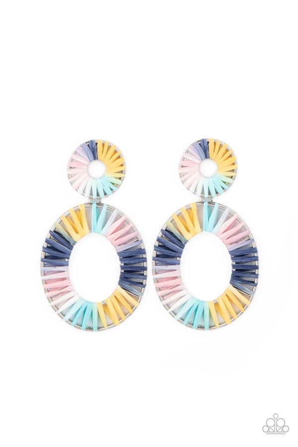 Tie-dyed wicker-like accents wrap around an oversized silver oval and dainty circular frame, linking into a colorful lure. Earring attaches to a standard post fitting. Also available in Blue