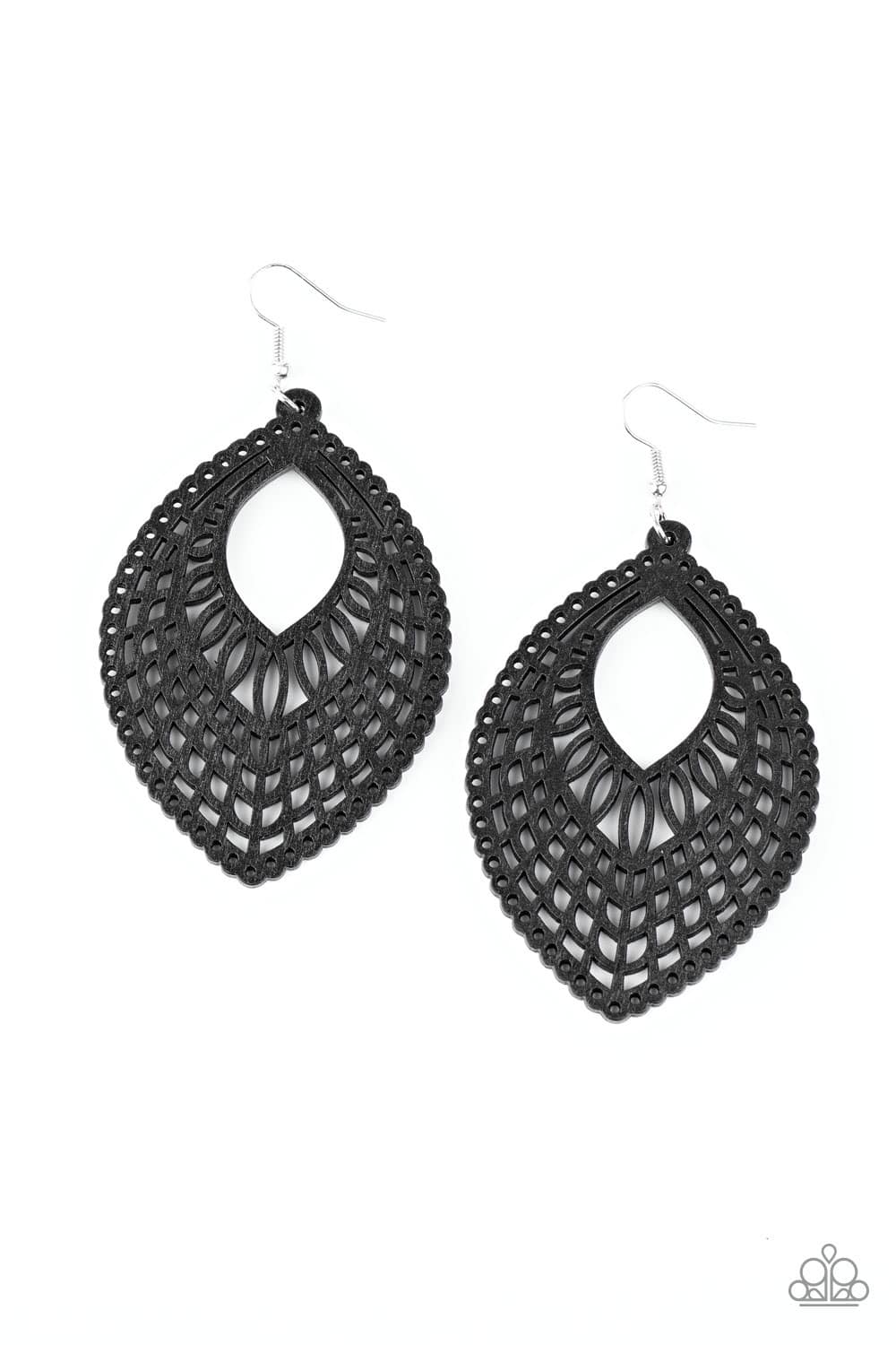Stenciled in an airy cutout pattern, a teardrop black wooden frame swings from the ear for a seasonal look. Earring attaches to a standard fishhook fitting. Also available in pink and purple