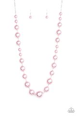 Infused with dainty pink pearls, a bubbly collection of oversized pink pearls link across the chest for a timeless finish. Features an adjustable clasp closure.