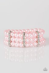 Classic blue pearls are threaded along elastic stretchy bands, creating colorful layers across the wrist. Encrusted in glittery white rhinestones, shimmery silver frames fit around the pearl strands, joining the bracelets. Also available in Pink