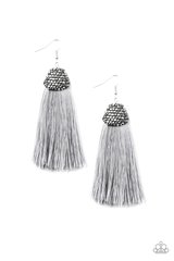 A plume of shiny gray thread flares out from the bottom of a glittery hematite encrusted frame, creating a dazzling tassel. Earring attaches to a standard fishhook fitting.