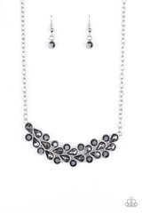 A collection of round and teardrop hematite and smoky rhinestones coalesce into a bowing silver pendant below the collar for a refined look. Features an adjustable clasp closure.