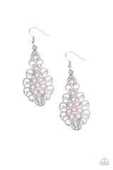 Dotted with glassy white rhinestones, elegant silver filigree curls around a pink pearl dotted center for a regal look. Earring attaches to a standard fishhook fitting.