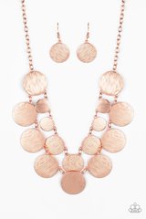 Featuring a blinding scratched shimmer, a collection of shiny copper discs link below the collar, creating radiant rows. Features an adjustable clasp closure.