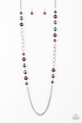 Varying in size, pearly purple, and oversized silver beads give way to sections of bold silver chain. Layers of silver chains drape across the bottom of the design for a flawless finish. Features an adjustable clasp closure. Also available in blue