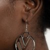 Painted in a black finish, flat wooden frames collect inside a geometric sliver fitting for a trendy fashion. Earring attaches to a standard fishhook fitting.