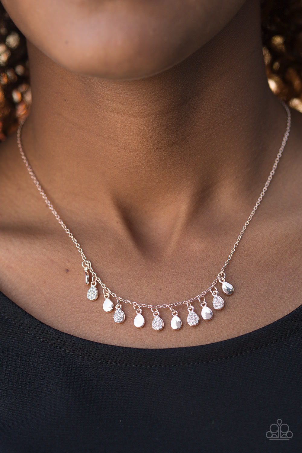 Featuring hammered, smooth, and rhinestone encrusted surfaces, dainty rose gold teardrops trickle from the bottom of a rose gold chain, creating a glittery fringe. Features an adjustable clasp closure.