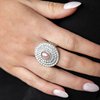 A pearly blue bead is pressed into the center of a round silver frame radiating with countless white rhinestones, creating a blinding statement piece. Features a stretchy band for a flexible fit. Also available in Black, Pink and White