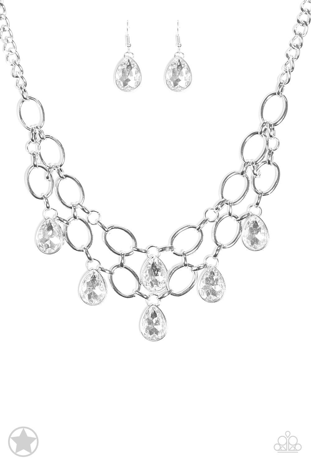 Joined by dainty silver links, two rows of dramatic silver chain layer below the collar in a fierce fashion. Glittery white teardrops drip from the glistening layers, adding a timeless shimmer to the show-stopping piece. Features an adjustable clasp closure. Sold as one individual necklace with matching earrings.