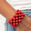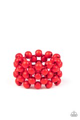 An oversized collection of sunny yellow wooden beads are threaded along stretchy bands that ornately weave across the wrist, creating a decorative summery pattern. Also available in Red