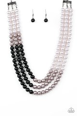 Joined together by a hammered silver fitting, strands of white, silver, and dark gray pearls cascade below the collar, creating an elegant ombre effect. Features an adjustable clasp closure. Also available in Black