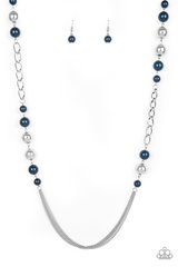 Varying in size, pearly blue, and oversized silver beads give way to sections of bold silver chain. Layers of silver chains drape across the bottom of the design for a flawless finish. Features an adjustable clasp closure. Also available in purple