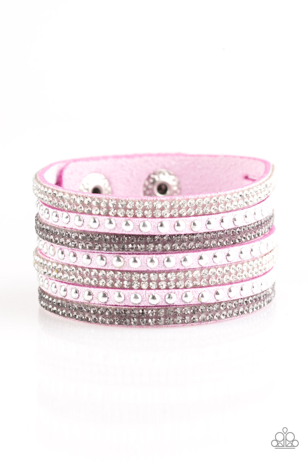 Shiny silver studs and rows of smoky and glittery white rhinestones are encrusted along strips of purple suede, creating sassy shimmer around the wrist. Features an adjustable snap closure.