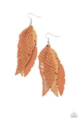 A mismatched collection of cork and black leather feather frames flutter from the ear, layering into a free-spirited lure. Earring attaches to a standard fishhook fitting. Also available in Brown